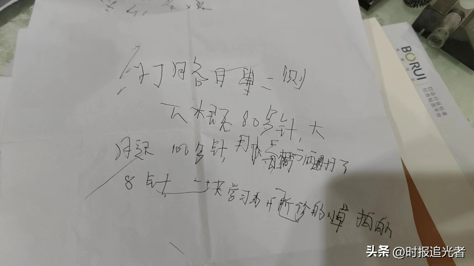 “打胳膊两侧,大概80多针,大腿100多针,小腿8针……”在一张白纸上,几行歪歪扭扭的黑色手写字体,是小丽(化名)被送进ICU前留给男子王先生(化名)的。