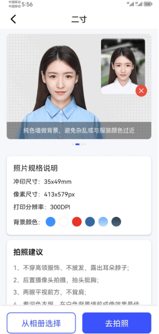 3、最后进入二寸照页面,按照要求着装,然后就可以拍摄二寸照的证件照了,保存至相册即可。