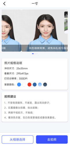 可以看到常见的一寸基础模板的规格说明中,为用户带来了详细的冲印尺寸、像素尺寸以及分辨率的说明,可选底色也可以在这快速进行浏览,还为需要当场进行拍摄的用户提供了专业的拍摄建议,按照建议拍摄可以让AI处理起来更加方便。