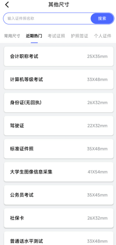 这里为大家提供了详细的证件类型分类,尺寸、热门、考试、签证……为用户带来了更为详细的证件模板信息,尺寸底色都帮用户轻松搞定,采用AI编辑处理,让用户更加省心。