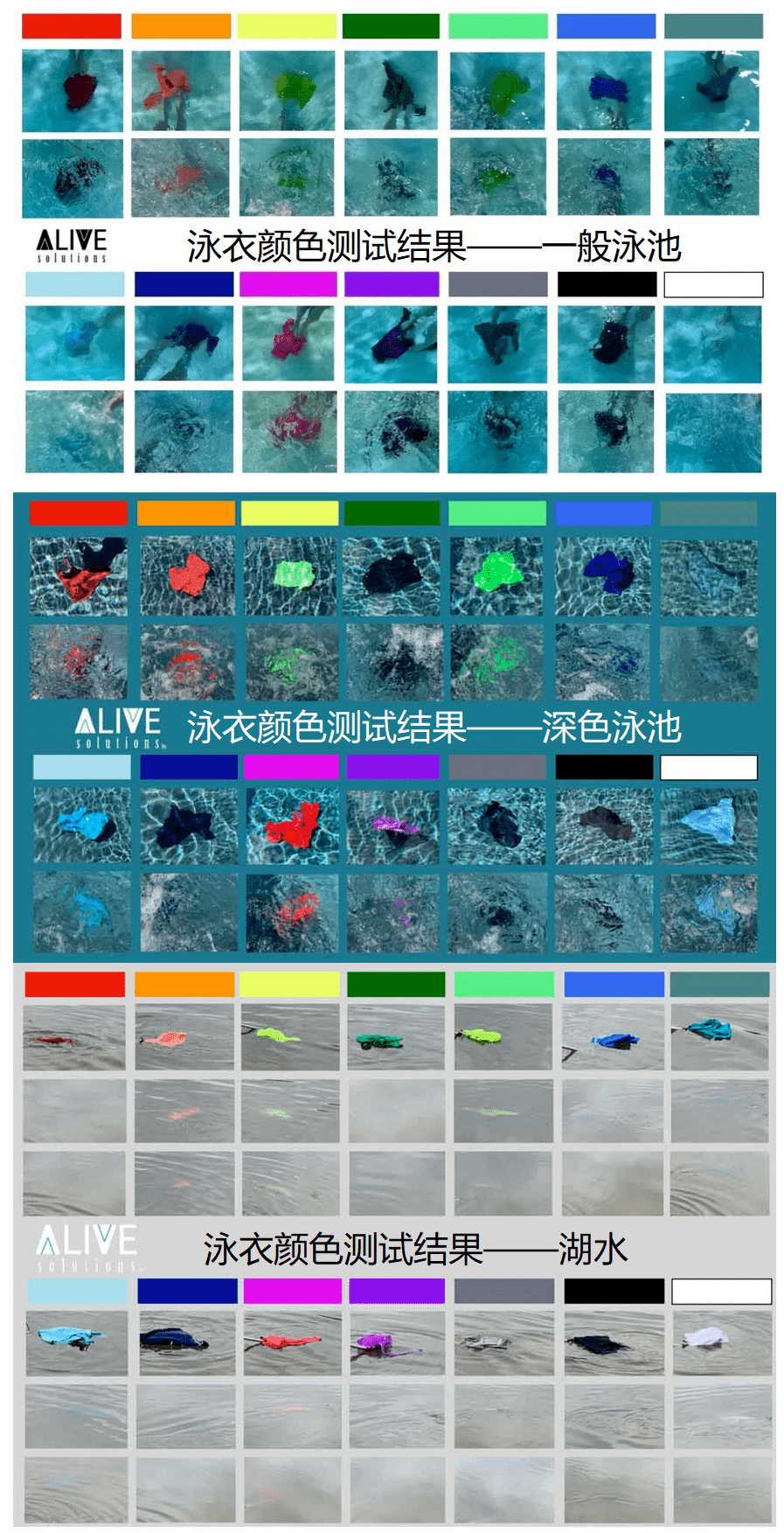 有专业机构开展了一项实验来研究泳衣颜色对儿童安全的影响,实验在室内泳池和户外湖泊中观察不同颜色的泳衣在平静水面、有波浪的水面的可见性,得出结论:在室内泳池和湖泊水中,对比度强烈的荧光色系均是最佳的泳衣颜色。