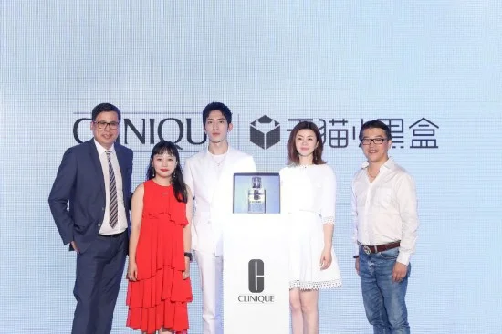 (合照从左至右:雅诗兰黛上海商贸有限公司电子商务总经理朱正华先生、天猫平台品牌营销中心总经理秀珣女士、倩碧亚太区品牌大使井柏然先生、倩碧品牌中国区总经理汤致俊女士、天猫大快消总裁古迈先生)