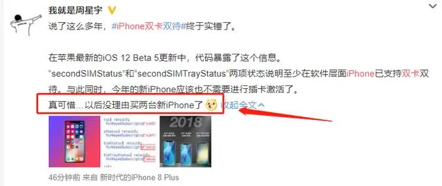 其实,早在上半年,知名分析师郭明錤就爆料表示,今年6.1英寸的廉价版iPhone将会支持双卡双待。不过,双卡双待几乎每年的爆料都会有提到,但最终还是了无音讯。不出意外,今年要亮相的新iPhone加双卡真的要实锤了!有网友打趣表示:“真可惜…以后没理由买两台新iPhone了 ”