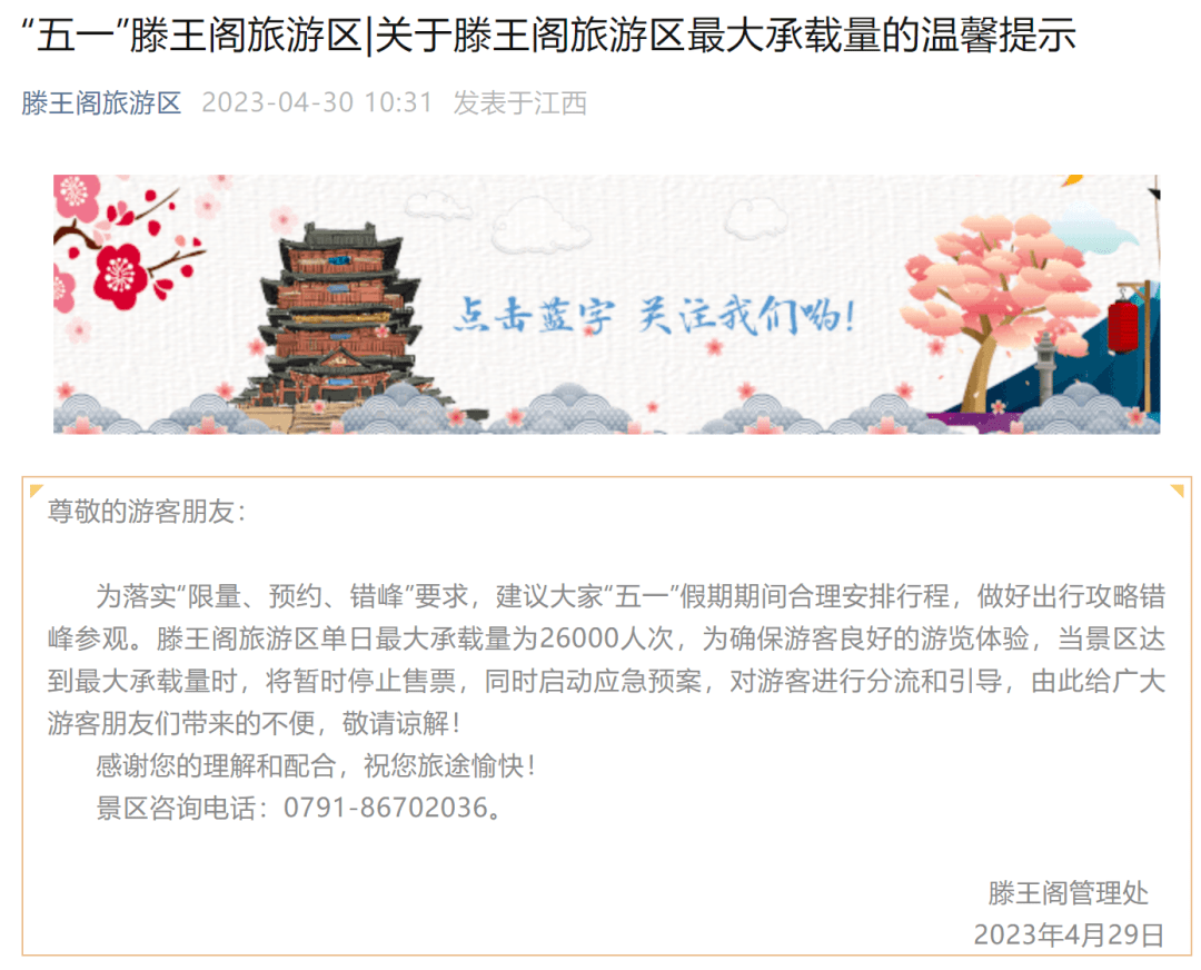 为落实“限量、预约、错峰”要求,建议大家“五一”假期期间合理安排行程,做好出行攻略错峰参观。滕王阁旅游区单日最大承载量为26000人次, 为确保游客良好的游览体验,当景区达到最大承载量时,将暂时停止售票,同时启动应急预案,对游客进行分流和引导,由此给广大游客朋友们带来的不便,敬请谅解!