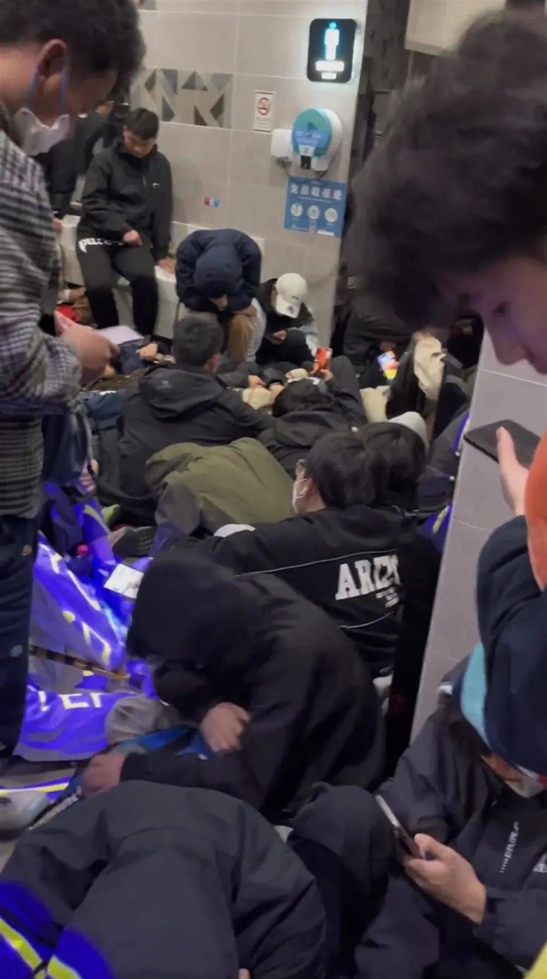 4月30日凌晨,据一名网友发布的视频显示,许多人或坐或躺在一间厕所里过夜,有人盖着毯子,有人则穿着单衣席地而坐。 现场还有语音提醒:“如果您执意夜宿,请您遵守公共秩序,不要影响他人正常如厕。”