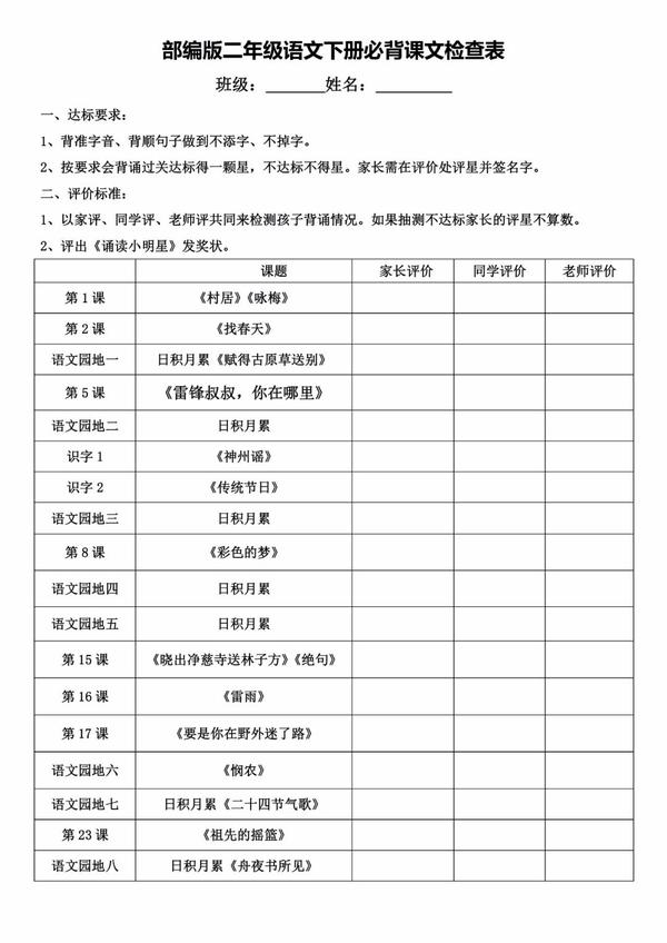 部编二年级语文下册必背内容(古诗、课文、日积月累)-二年级下册语文积累背诵