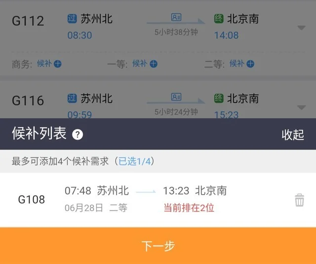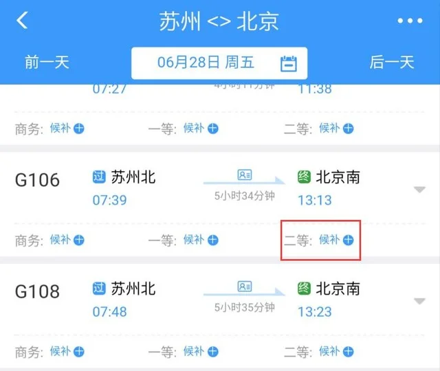 2、页面会自动出现候补的按钮,旅客可根据需求点击相应车次、席别对应的“候补”按钮,系统将该需求加入当前候补购票需求列表。