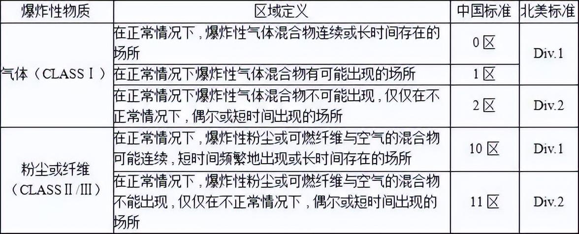美国和加拿大首先将散布在空气中的爆炸性物体分成三个 CLASS( 类别 ):CLASSⅠ气体和蒸气 ; CLASS Ⅱ 尘埃 ; CLASS Ⅲ纤维 .然后再将气体和尘埃分成 Group( 组 ) :