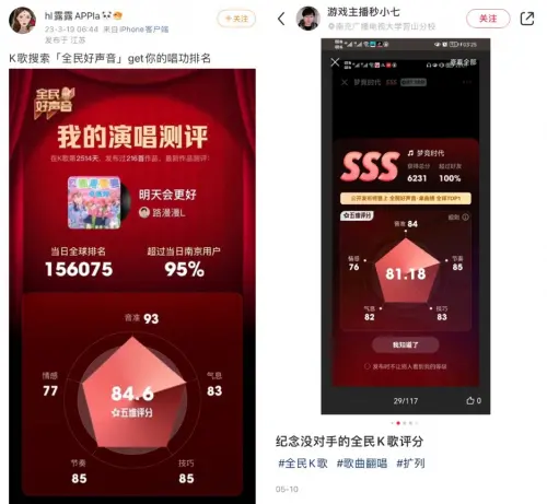 据了解,全民K歌全新升级的“五维评分”是全网首个集AI学习模型和专家系统于一体的智能演唱评分系统,除了能在演唱的音准、节奏、气息、情感、技巧五个维度上给出基础评价之外,“五维评分”还增加了大量样本的AI学习,可以更大程度还原人耳对歌声的悦耳度感知,让针对演唱作品整体好听度的判断更加大众化与个性化。网友“hl露露APPla”和“游戏主播秒小七”就在社交媒体上晒出了自己演唱作品的“五维评分”结果,80+的得分让他们直呼离“没对手”又更近了一步,还有不少网友来向其讨教演唱技巧,都想下次能取得更亮眼的分数!