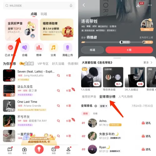 听了这么多,各位K歌发烧友应该想秒冲至“打榜现场”了吧?小编这就呈上体验攻略:打开全民K歌后进入点歌台,点击页面上方海报即可进入“全民好声音”榜单。友友们也可以在选好K歌单曲后,在伴奏页面查看这首歌的“全球得分榜”,点击进入榜单。