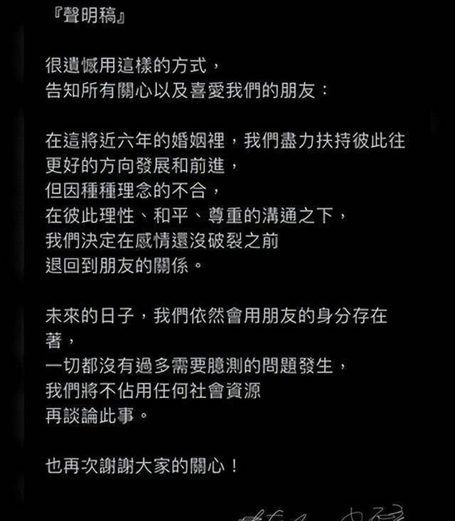 黄育仁表示在这将近6年的婚姻中,他和刘雨柔尽力扶持彼此,希望两人都往更好的方向迈进,「但因种种理念的不合」,双方经过理性和平的沟通下,「决定在感情还没破裂之前,退回到朋友的关系。」