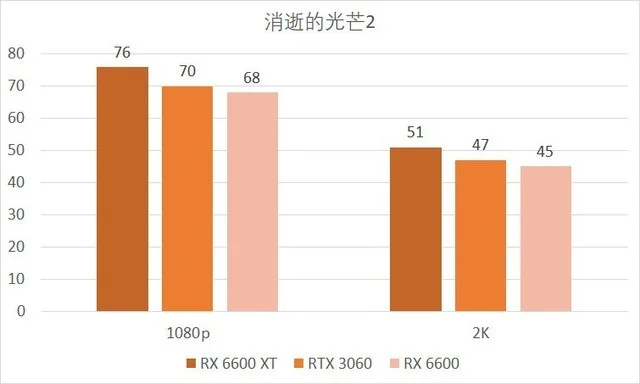 可以看到,1080p下开启Ultra分辨率RX 6600XT帧数可以达到76帧,RTX 3060帧数70帧,RX6600帧数68帧,2K帧数略低。RX 6600 XT平均领先RTX 3060约8.6%,领先RX 6600约12.6%