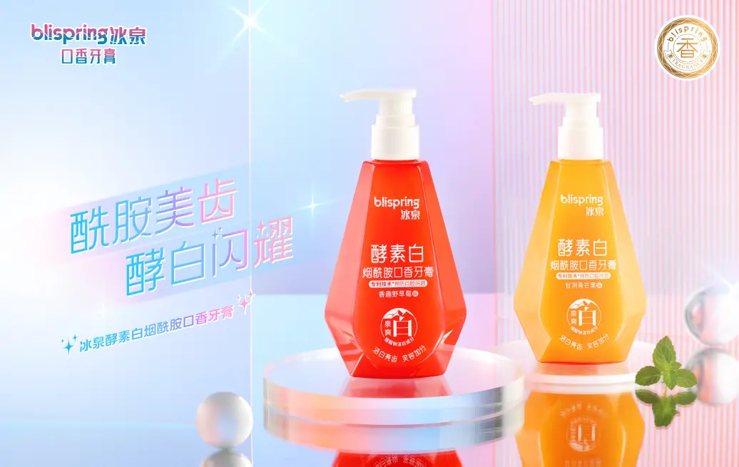 在清新口气上,冰泉酵素白烟酰胺牙膏共打造了香趣野草莓味和甘冽青芒果味两种香型,以天然鲜果提取物为香味原料,由国际香氛融合法式格调进行精创调香,浓浓果香,清新怡人,帮助扫除口腔异味。同时,富含维生素、花青素,让你说话清新怡人,提升牙龈抵抗力。