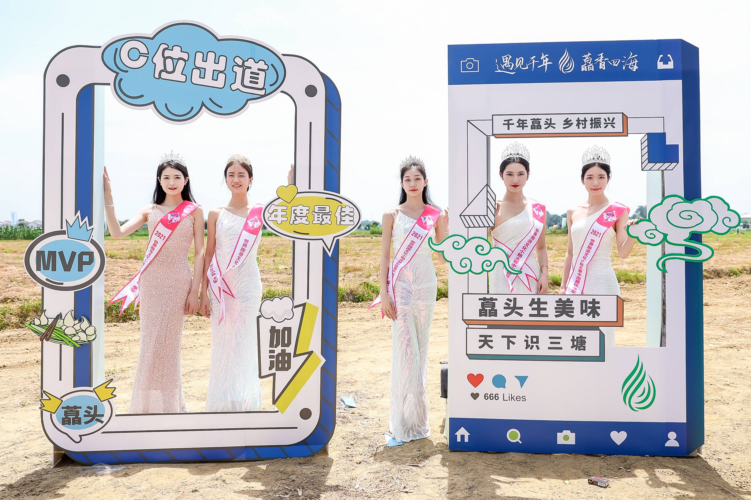 2021世界旅游文化小姐中国区季军伍玥、湖南区冠军邓彦妍、中国区文旅大使易蓉、李心怡、曾格格等五位世界旅游文化小姐亲临现场为湘阴藠头代言,为中国藠头之乡加油助力,藠头采收田间临时搭建的logo牌成了她们的T台,镜头中展示着她们对这片藠头土地的热爱与赞颂,更传达出对藠头产业蓬勃发展的满满自豪之情!