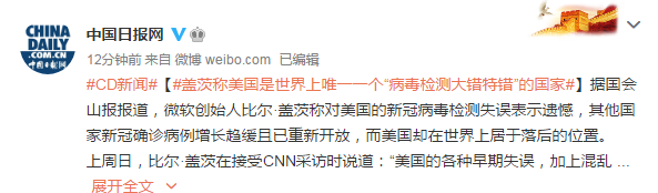 据国会山报报道,微软创始人比尔·盖茨称对美国的新冠病毒检测失误表示遗憾,其他国家新冠确诊病例增长趋缓且已重新开放,而美国却在世界上居于落后的位置。