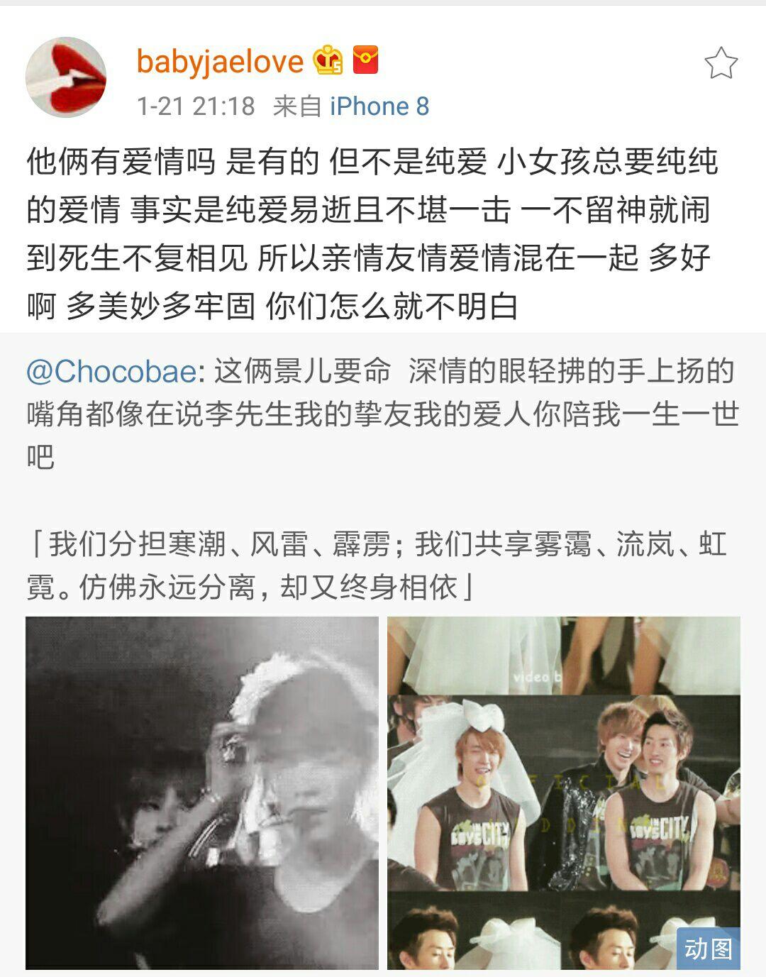 我觉得他们更是知己,遇到都不易了,他们却在茫茫人海中相遇,并且此生只得唯一。以上是赫海入伍前到现在发的我比较印象深刻的狗粮,还有很多很多小糖我实在不记得了,他们两发糖太快了,演唱会三天就逼死我了(捂脸)。