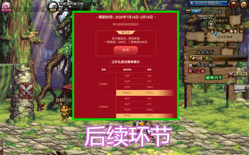 Q币福袋2:8Q币/18Q币/100Q币/7950Q币,虽然最高奖励的概率仅为0.001%,但是抽中以后就可以买多19套春节礼包。