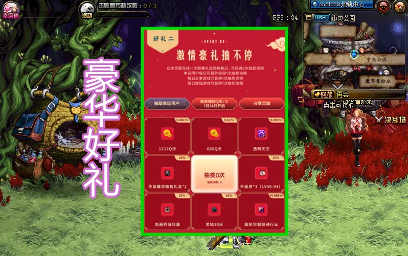 除了上面的内容以外,这次还增加了抽奖环节。玩家可以在1212Q币/666Q币/透明天空/华丽的徽章随机礼盒*2/升级券(Lv90-94)*3/凯丽的强化器/黑钻30天/超星空裂缝通行证中随机获得一样。
