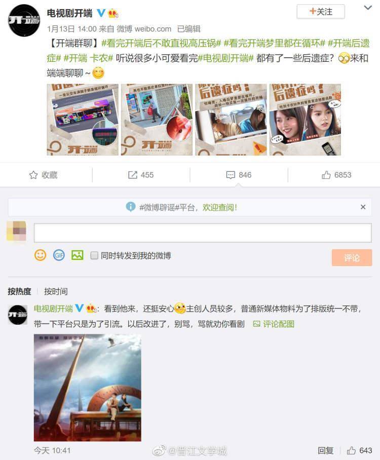 《开端》官方微博解释称,因为主创人员多,普通的新媒体物料为了排版统一都不带主创名单,只是带平台“引流”,以后一定会改进。