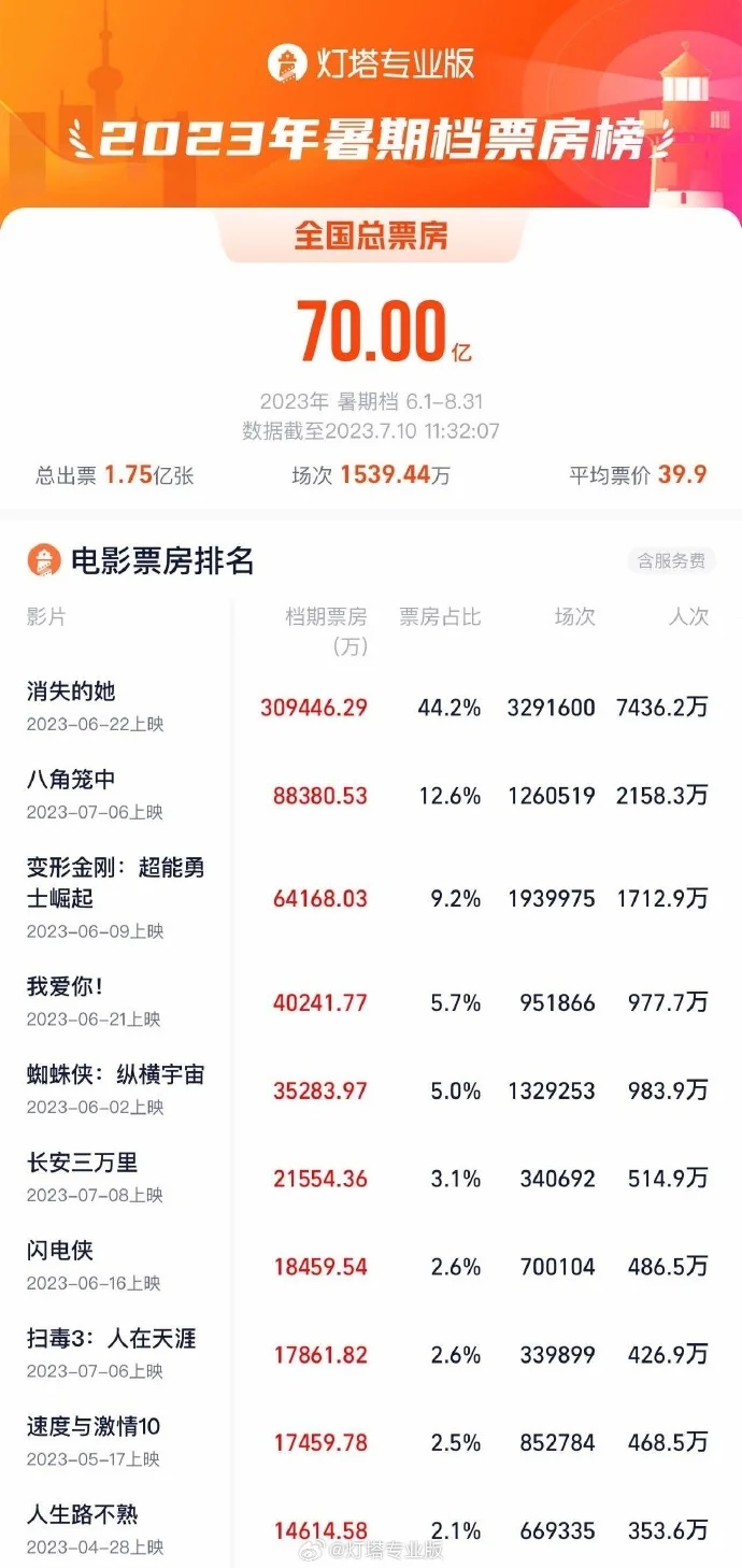 同时,其他影片也表现抢眼。据灯塔专业版实时数据,截至7月10日11时32分,2023年暑期档(6月1日-8月31日)总票房(含预售)突破70亿,《消失的她》《八角笼中》《变形金刚:超能勇士崛起》暂列暑期档票房前三位。