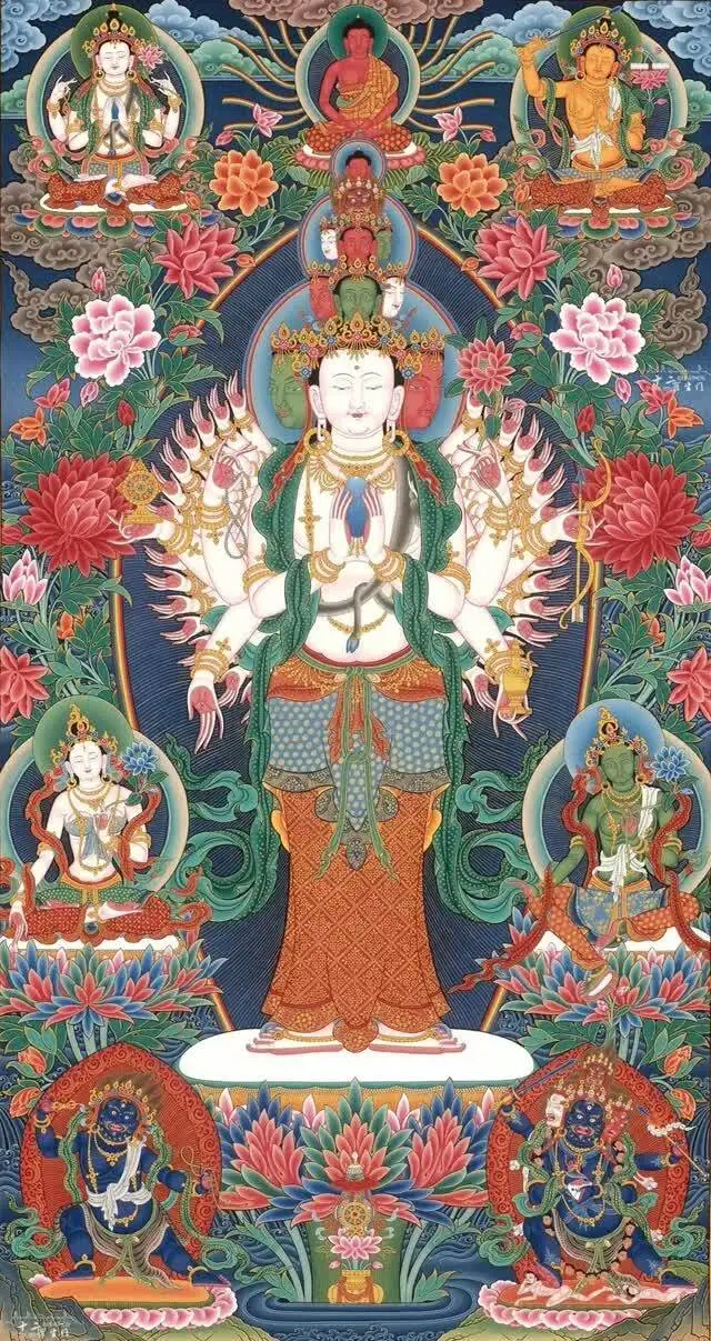 根据《大悲心陀罗尼经记载》:本师释迦牟尼佛说法时,观世音菩萨即从座起,白佛言:「我有大悲心陀罗尼咒,现在应当要说出来,为使一切众生得到安乐故.........若我当来堪能利益安乐一切众生,令我实时身生千手千眼,发是愿已,应时千手千眼具足。」