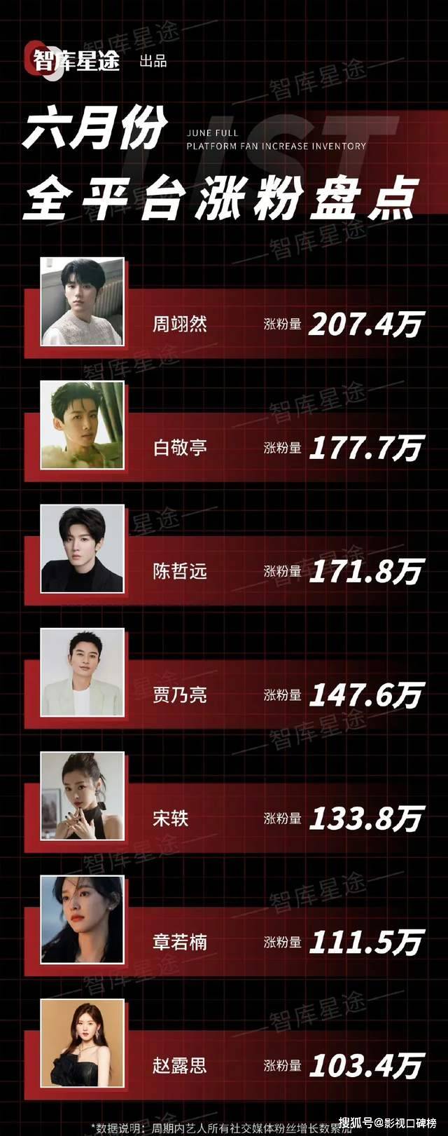 这些剧百花齐放,看看谁比较能打?常见的评分、口碑等是评判标准,主演们的粉丝活跃度和增减量往往也能做一个参考。所以六月全平台涨粉之王到底是谁呢?是白敬亭、赵露思,还是肖战、陈哲远?居然都不是,周翊然,这个相较于上述几位演员来说比较陌生的名字,以207.4万的涨粉量夺得第一。