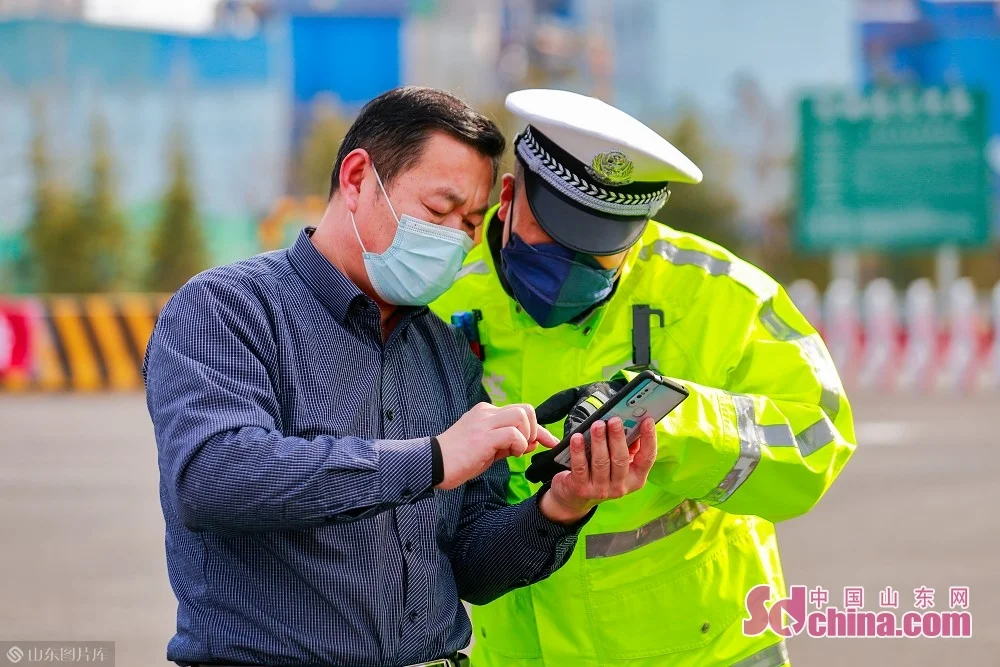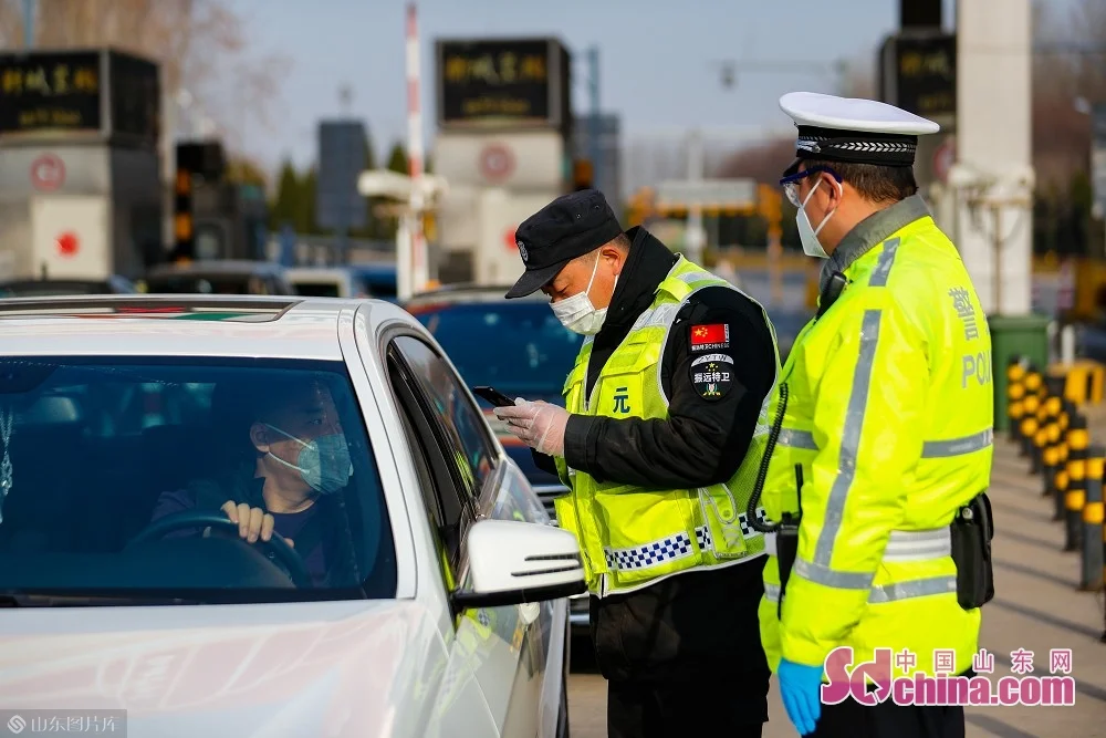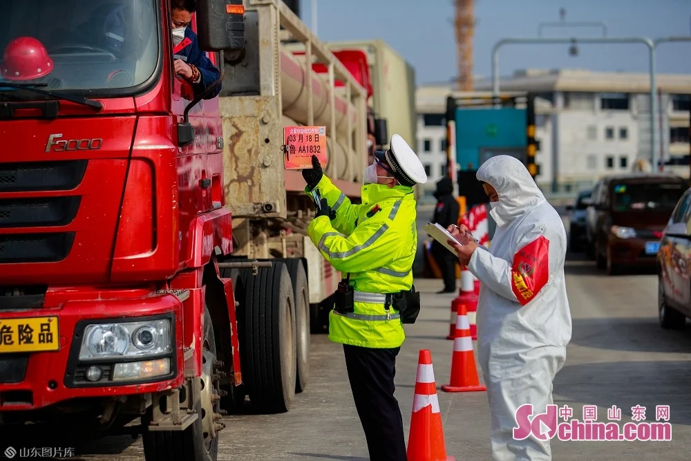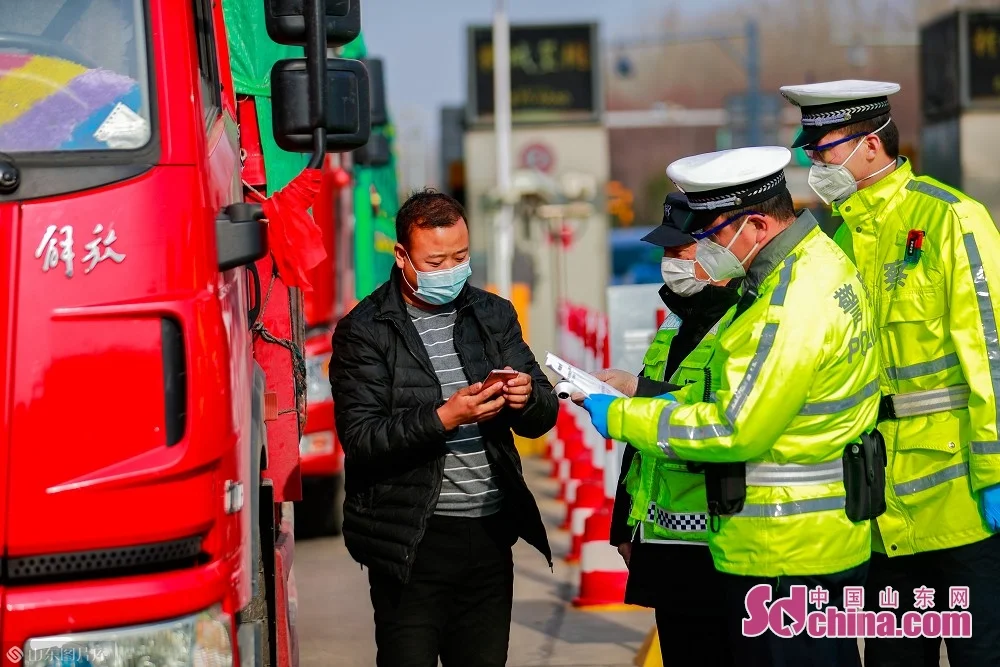 2月19日,山东高速济南西收费站出口,济南槐荫交警大队民警正在对下高速车辆进行检查,对运输生产、生活、防疫应急物资的货运车辆本着安全、高效、及时的原则快速通关,在确保安全的前提下全天通行,最大限度满足复工复产运输需求。据悉,济南公安交警部门18日特别推出保障复工复产、服务经济社会发展10条举措,方便交通运输。济南交警派驻警力24小时值守济南市的45处高速公路收费站和28处国省道市界检查点。(摄影 张仁玉)