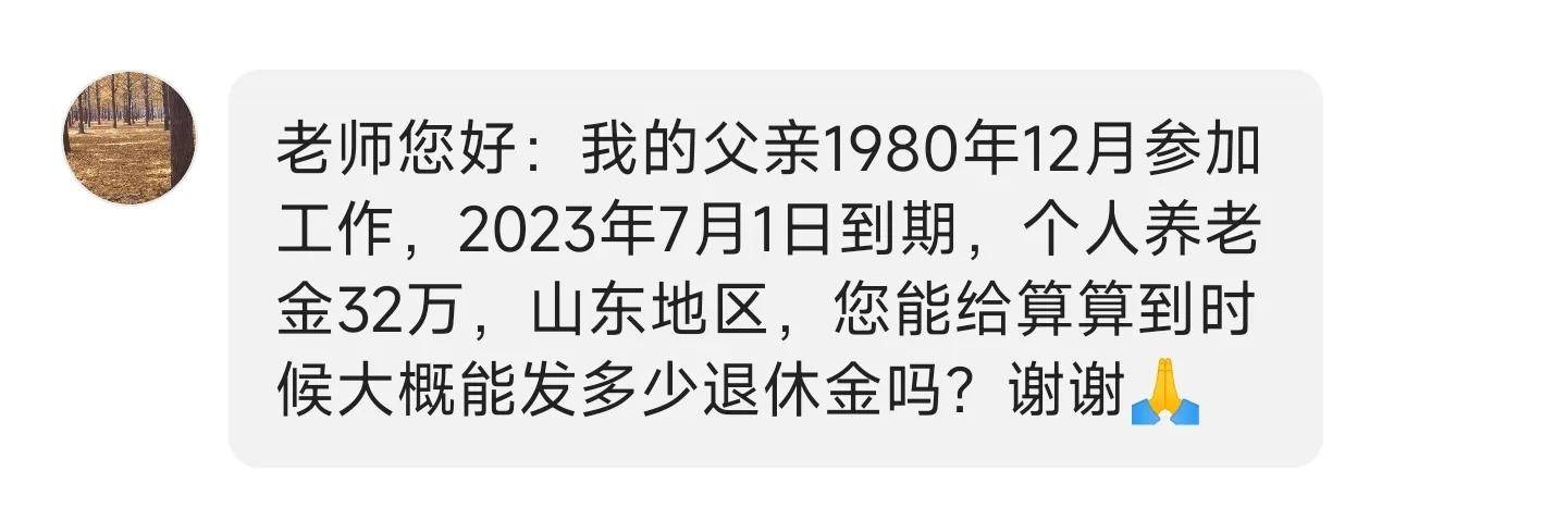 今天看到一位山东的朋友留言,称自己的父亲是1980年12月参加工作,2023年7月1日退休,个人(账户)养老金余额高达32万元,这种情况下养老金能发多少钱呢?