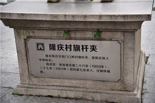 从旗杆石可以得知,隆庆清代末年出过一名举人,也就是陈政宣,官职是翰林院编修。虽然历经100多年风雨沧桑,但是旗杆石仍然保存完好。耸立着的石柱,成为中国科举考试制度的活化石印证。旗杆石,古代是用来标榜身份、光宗耀祖的。古代科举制封建社会里,经过科举应试获得功名者,就可在宗祠或祖屋门前竖旗杆石,以此彰显身份,昭示世人,激励后辈。