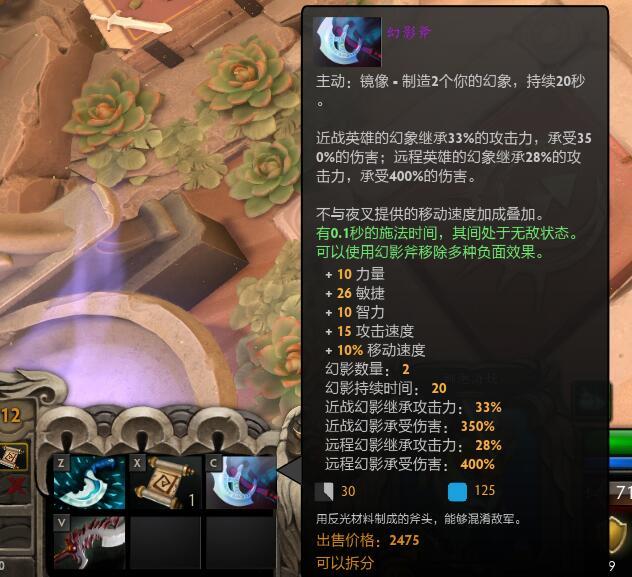这里再补充一下幻象,幻象可以借由技能、装备和幻象神符产生,无法使用主动技能和主动道具,但是却继承被动技能和被动装备的效果(也不是继承所有的被动道具效果,过于不平衡的不会出现,不然10个幻象可以和晕锤搭配的话……那别人不用玩了,晕到死),例如辉耀(对应LOL里的日炎斗篷,出了辉耀拉幻象兵分三路去刷钱效率不要太高)、真视宝石(你用幻象就能做到安全排眼了。。。)。一般情况下幻象本身受到的攻击是本体的几倍,但是造成的伤害只是本体的几分之一(不同的技能产生的幻象数值都不同,也会有100%攻击的幻象),而且幻象存在一定时间后会消失(也是根据不同技能有不同的时间长短)。