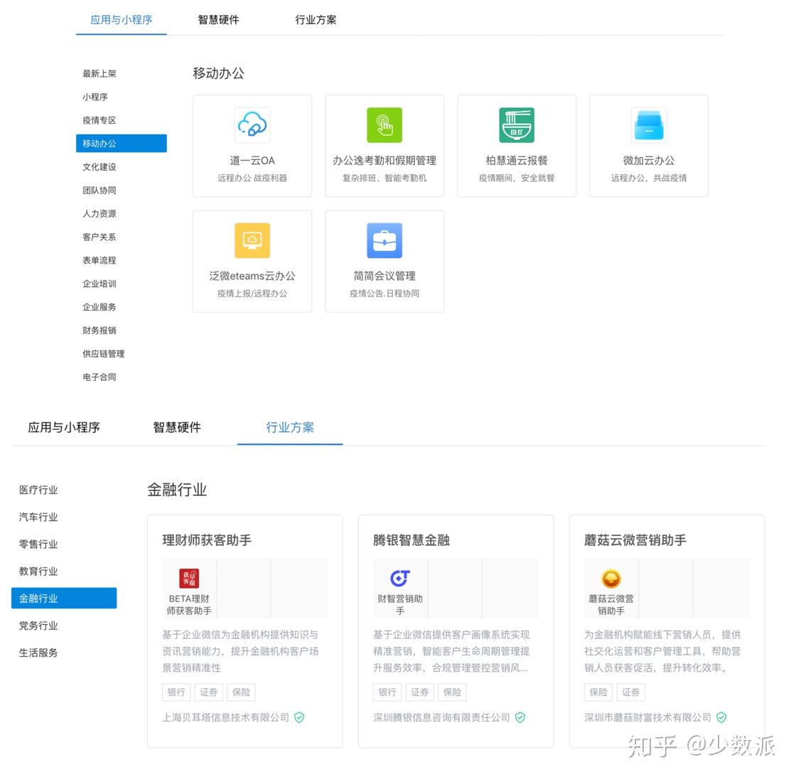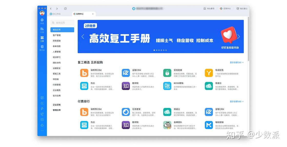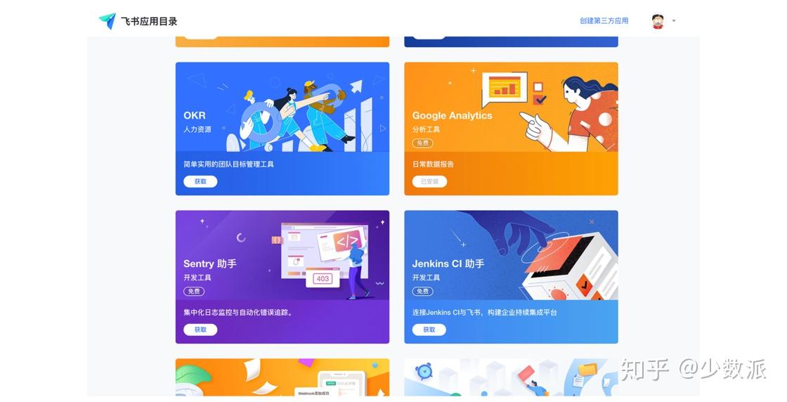 飞书则采取精品路线,重点接入北森、问卷星、法大大、赢在销客等各领域的头部厂牌,并对 Dropbox、Jira、ProcessOn 等全球性产品提供了良好的支持。另外,飞书要求所有接入产品都采用统一的小程序形式以确保运行效率和体验。作为后晋的「新选手」,飞书从品牌形象到第三方伙伴都呈现出更加年轻化、国际化的特点。