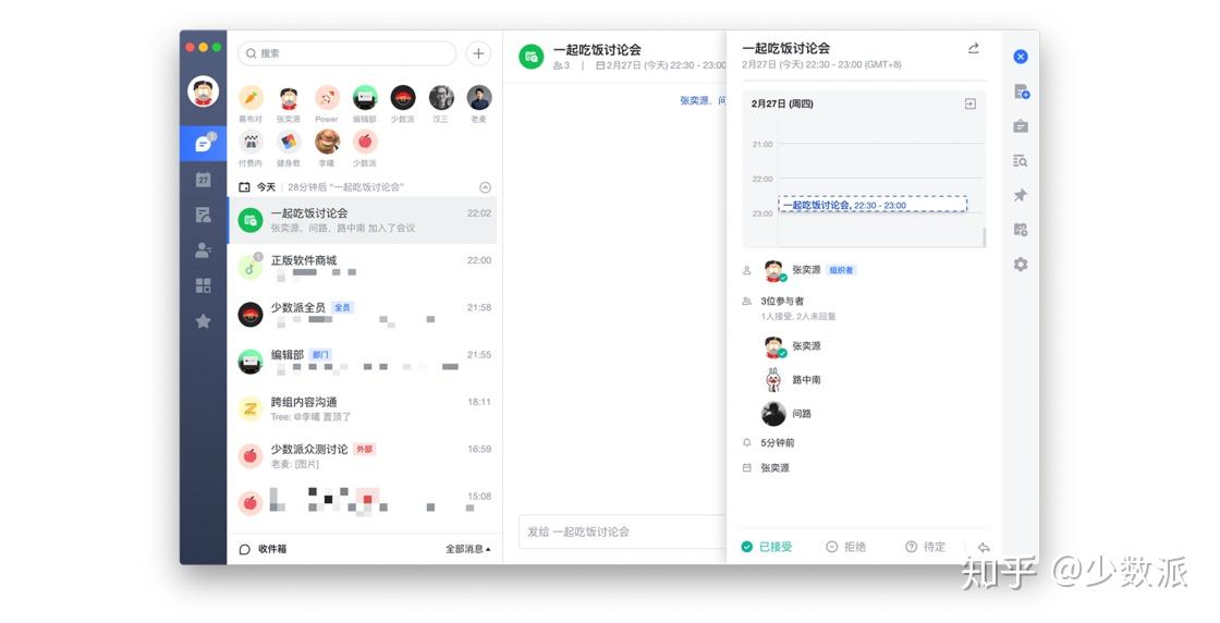 飞书作为在线办公领域的新面孔,尽管没有去抢企业社交初潮时的风口,却以观察者的身份看到了不少 B 端用户的真实痛点。因此,在飞书的产品思路上,你可以非常直接地感受到开发团队对于提升办公效率的重视和投入。实际的使用体验也是如此,飞书的每一个功能点都不满足于「有了就行」,而是加入了能解决用户痛点的小设计。如果说钉钉是掌握了「先发优势」,在企业社交领域扎根更久,那飞书则更多了一份复盘全局之后的理性思考,产品气质也更加现代。