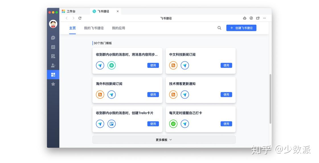顺带一提,三款工具都内置了机器人(bot)系统,用来处理消息提醒和第三方服务。不过入局更晚的飞书却在机器人开发上走在了行业的前列。此前的文章中,我就提及过飞书机器人对不同消息的过滤和抓取能力,而最近飞书更放出了全新的自动化系统「飞书捷径」,整体思路很像 IFTTT,具体功能却紧扣飞书的产品特性。简单地说,飞书捷径可以自动完成一整套操作流程,譬如「直接将群里 @ 你的每条信息都汇总在表格内」,或者「将包含特定关键字的消息自动创建为 Trello 看板」等,进一步减少你做机械重复的劳动。该方向蕴含着巨大的潜力,在未来的文章中,我会重点关注飞书捷径的新玩法。