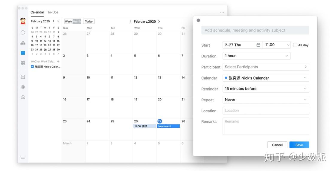 和钉钉日历比起来,企业微信的日历功能就简单了太多。当你新建日程时,只能填写时间、地点、人物、事件等基础讯息,诸如「自动生成会议群组」、「自动生成会议记录」之类的功能一概没有,和其它功能模块的联动也几乎为零。